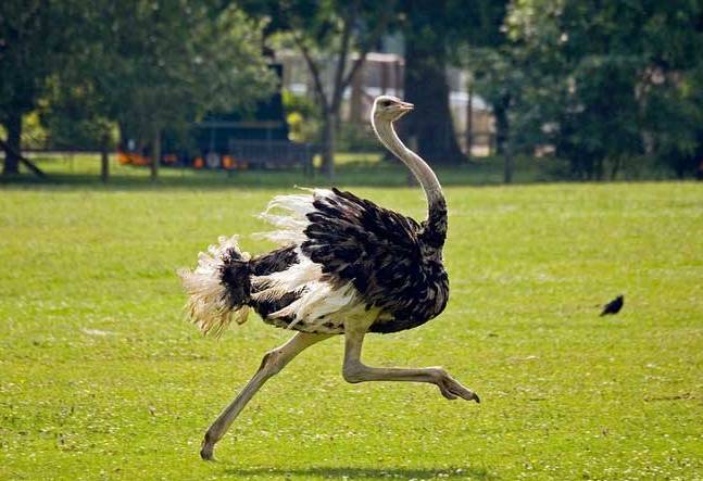 Страус – самая быстрая нелетающая птица на Земле. Обитает в открытых саваннах и полупустынях. В случае опасности он бросается в бегство, развивая скорость до 60—70 км/ч и делая шаги в 3,5—4 м длиной, и при необходимости круто меняет направление бега, не снижая скорости. Бежать с подобной прытью птица может около получаса.