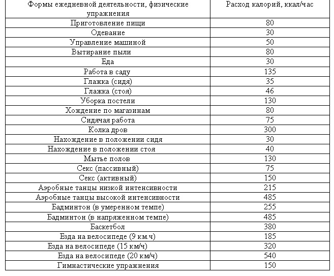 Для того, чтобы было легче определить расход калорий за день предлагаем таблицу.