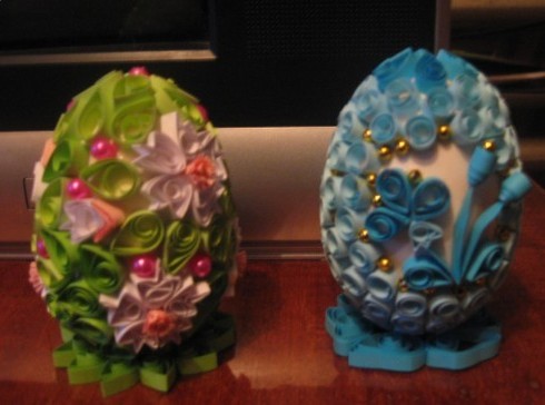 А вот еще один способ - украшение пасхальных яиц в технике квиллинг. Желательно сначала продумать рисунок, а после подготовить все необходимые элементы. Элементы делаем, накручивая бумагу на зубочистку, а после придавая скрученной бумаге пальцами нужную форму. Когда все нужные детали будут готовы, принимаемся за их размещение. С помощью клея ПВА приклеиваем элементы к скорлупе.