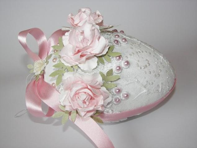 Окрашенное или обычное белое пасхальное яйцо можно задекорировать также атласными лентами или кружевом.