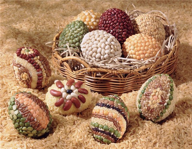 Для украшения пасхальных яиц можно использовать различные крупы, макароны. Наносим при помощи клея.