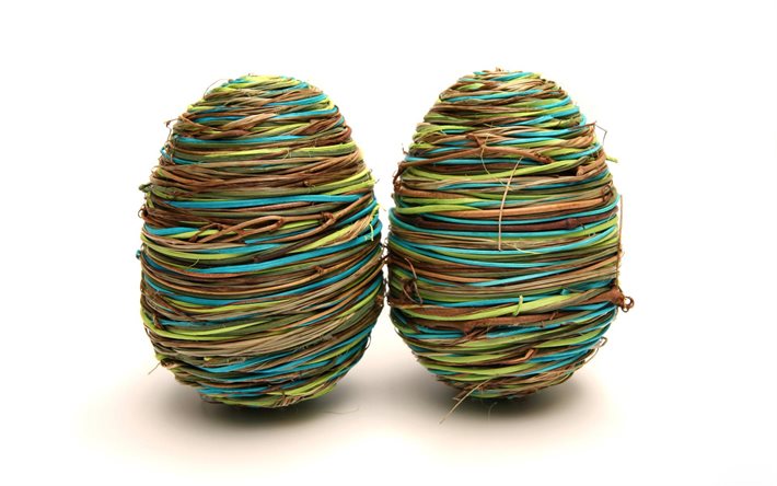 Интересным украшением является обкручивание пасхальных яиц нитками, травой, соломой. На яйцо нанесите клей и обмотайте, начиная сверху.