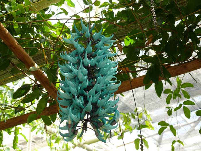 Нефритовый цветок — редкий вид лиан. Растет на Филиппинах и имеет очень необычный бирюзовый окрас. Цветки имеют форму когтя и собраны в огромное соцветие. Его стебель может достигать в длину 18 метров, а скопления цветков – 3 метров. Растение светится в ночное время и привлекает на свет летучих мышей, которые повисают на соцветии вниз головой, выпивая нектар. Они же и опыляют его. Эти редкие цветы находятся под угрозой исчезновения.