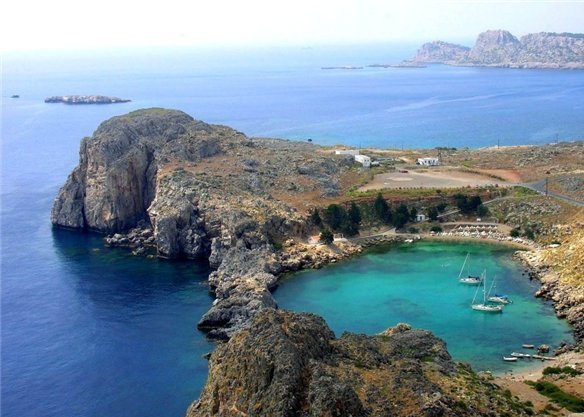 Бухта Святого Павла, красивейшая бухта в форме сердца. Она отделена от моря скалами. Можно плавать в самой бухте, а можно выплыть в открытое море. Это одно из немногих мест Родоса с песчаными пляжами. Рядом находится небольшая церквушка, в которой проводятся венчания. Именно в этой бухте когда-то Апостол Павел проповедовал Христианство.